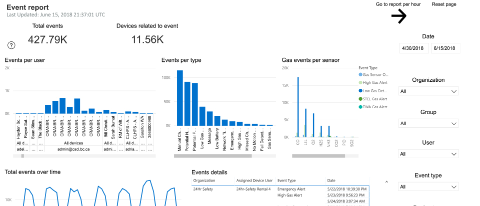 This report delivers a high-level overview of all data collected from a fleet of G7 gas detectors in the field. Teams can drill down using a series of filters to view the information that's important to them, including events per user, group, organization, type of data and even gas sensor variety. The report displays data trends over time so businesses can monitor how employees are making use of gas detection equipment, keeping it in working order and easily identify areas of potential optimization.