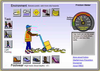 Una herramienta/juego entretenido de keeptruckingsafe.org permite a los usuarios someter a un empleado virtual a diferentes condiciones meteorológicas, tipos de calzado y tareas con el fin de ver el impacto de diversos factores en el riesgo de sufrir un resbalón, tropiezo o caída.