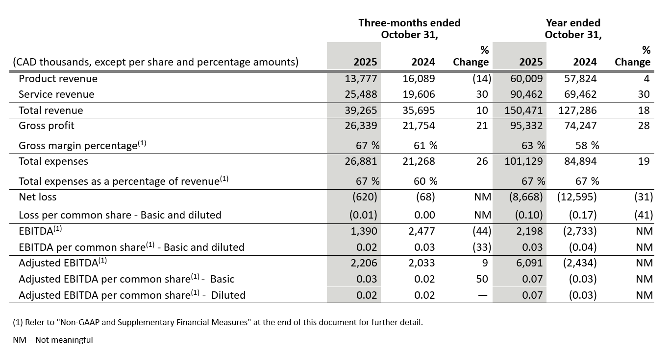 Voor het boekjaar dat eindigde op 31 oktober 2025 steeg de totale omzet met 18% op jaarbasis tot 150,5 miljoen dollar. De omzet uit diensten steeg met 30% tot 90,5 miljoen dollar, terwijl de omzet uit producten met 4% steeg tot 60,0 miljoen dollar. In Noord-Amerika groeide de omzet van het bedrijf in de VS met 16% ten opzichte van vorig jaar, terwijl de omzet in Canada met 22% steeg. De omzet in Europa steeg met 19% ten opzichte van vorig jaar, terwijl de omzet in de rest van de wereld met 21% groeide, ondersteund door uitbreiding in het Midden-Oosten, waaronder onze onlangs aangekondigde meerjarige koopovereenkomst met een van 's werelds toonaangevende energieproducenten, de Abu Dhabi National Oil Company (ADNOC).