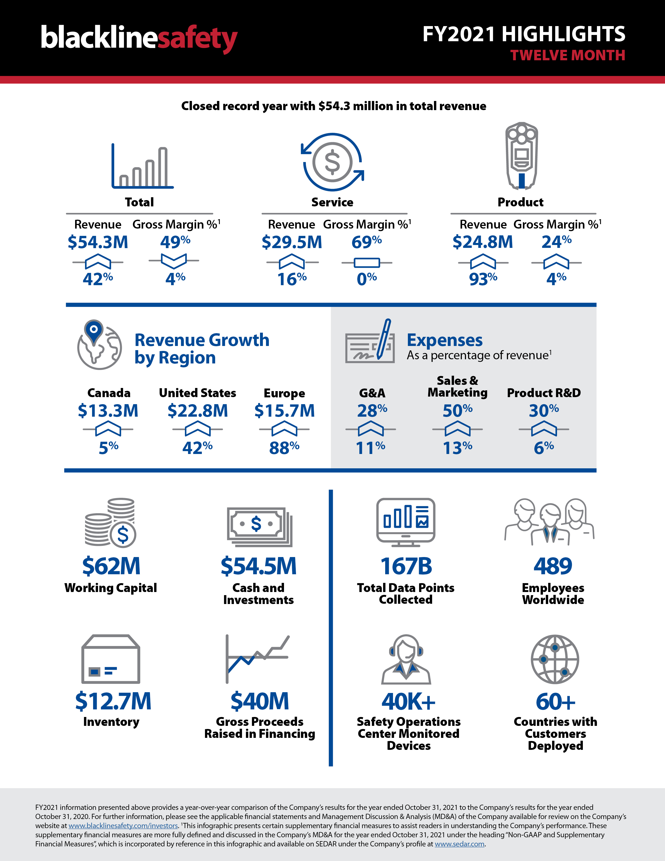 Service gross margin percentage(1) improved to 69% in the fourth quarter from 67% in the prior year quarter excluding the impact of the Canadian Emergency Wage Subsidy (“CEWS”). Product gross margin percentage(1), though impacted by ongoing global supply chain challenges, remained strong at 30% with growing sales of the Company’s G7 EXO area gas monitor contributing proportionately higher product margin compared to our other connected safety devices. Blackline closed the fourth quarter with cash and short-term investments of $54.5 million and no debt. The Company’s cash position enabled it to invest in manufacturing infrastructure and support the working capital required to achieve record product deliveries during the quarter, despite ongoing challenges in the global supply chain.