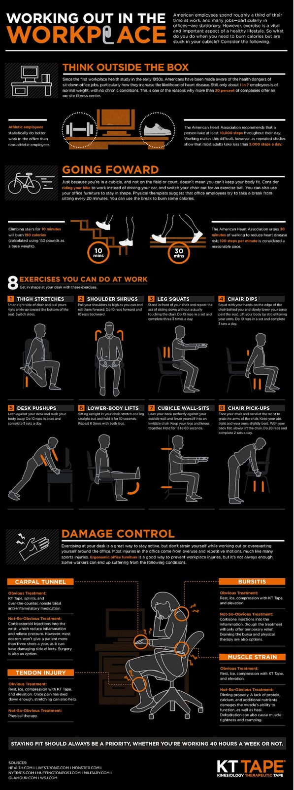 Você está praticando exercícios suficientes no local de trabalho? Este infográfico da Mashable demonstra algumas maneiras de se manter ativo se você perceber que fica muito parado durante o dia de trabalho. Lembre-se de reservar algum tempo todos os dias para alongar os músculos e praticar um pouco de exercício! Isso pode ajudar a prevenir doenças como cardiopatias e diabetes, evitar lesões e reduzir o risco de depressão.